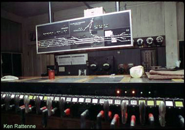 The interlocking machine in College Park Tower. Trackage taken out of service is reflected on the track diagram board by paintingover the affected route with black paint. (Ken Rattenne Photo) |