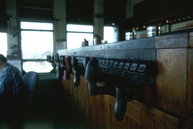 Protruding from within each interlocking cabinet wererows of inverted "L" shaped pistol-grip handles, molded to fita hand. These grips literally ran the length of the interlocking cabinet,one for each switch and each signal operated within the towers' limits.The stem of each lever was coded by a band of color: Black for switches,red for signals. Above each cabinet was a metal box. On its surface eachtrack and turnout was represented in a route diagram. A panel light wasset next to each representation of a switch, illuminating when a trainpassed over its track sensor. Each light was numbered to correspond tothe correct controlling lever on the interlocking cabinet. This arrangementresulted in two rows of levers, one above the other, for each switch andits signal.