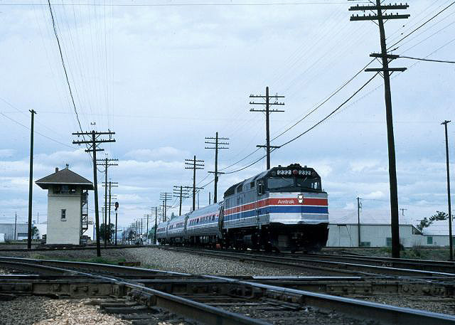 | As storm clouds roll in from the west Amtrak 232 passes Stockton Tower as it clatters across the Western Pacific Second Subdivision mainline on April 20, 1980. Manned by Santa Fe employees, Stockton Tower seldom delayed Amtrak, preferring to givie the San Joaquins a greenboard across the SP and WP main lines that crossed the Santa Fe at grade. |