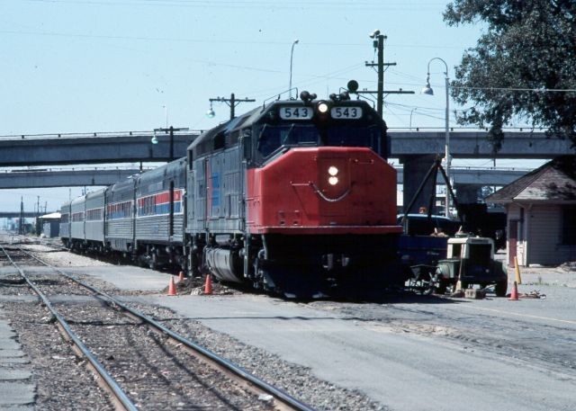 | SDP40F No. 543 creeps through Stockton on April 19, 1976 only moments from pausing at the beautifully maintained Santa Fe depot. These big bruisers were actually just SD40-2s with cowling and a pair of steam generators. Graduating from EMD's Class of 1974 the 543 was one of two units transferred to the West Coast from Floridian service for use in the San Joaquin pool. |
