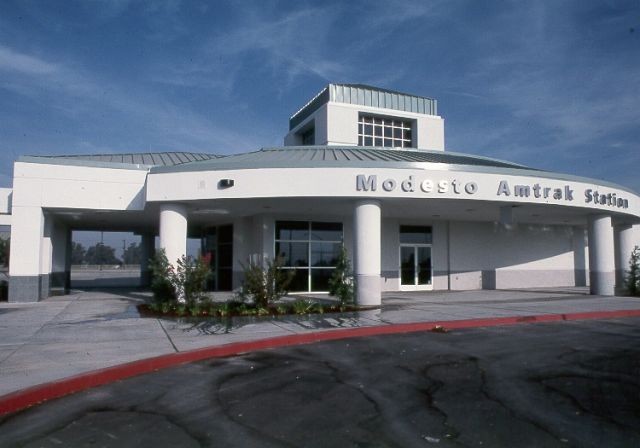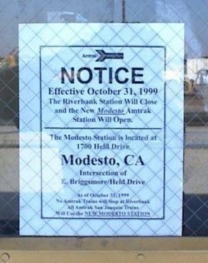 | For several years the City Of Modesto had been lobbying Amtrak and CalTrans to move the "Modesto" station stop from Riverbank to Modesto. In 1999 their efforts paid off when the brand new Modesto station opened for business on October 31, 1999. After the opening, the Riverbank depot reverted to BNSF as sole occupant. | In Riverbank a sign announcing the location change was posted in the depot window. |