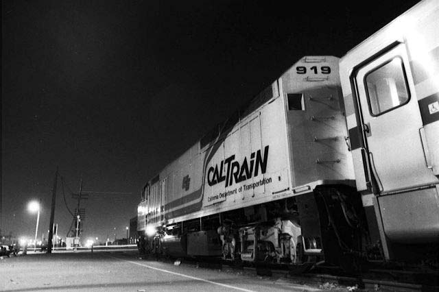 | In 1990 CalTrans "loaned" Amtrak CalTrain F40 919 for service on the San Joaquin Corridor. Engine crews didn't like the 919 because the CalTrain F40PH-2s use blended braking rather than dynamic braking. Railfans liked the 919 because it still had a working Mars light and was a nice break from the standard Amtrak F40s. Seen in Bakersfield on a balmy July evening, the 919 has just brought it's train to a stop and is waiting for passengers to detrain so the crew can wye the consist. |