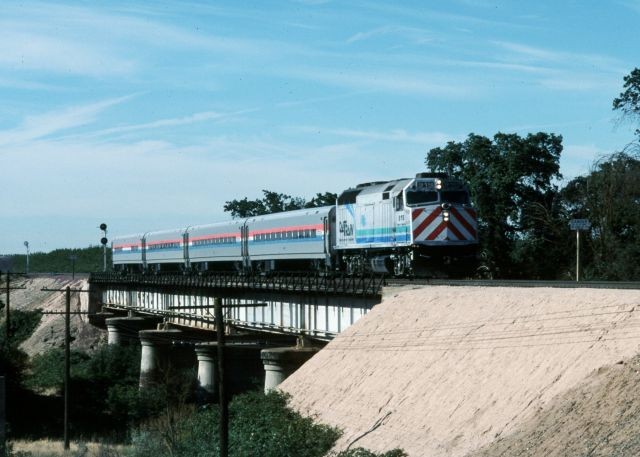 | A more traditional view of Dry Creek Bridge finds borrowed CalTrain 919 crossing the span Oakland-bound on June 9, 1990. Today this spot is more or less inaccessible to photographers due to the building of a gated housing development. However, a short walk along the right-of-way from Briggsmore Avenue in Modesto will yield a similar photo |