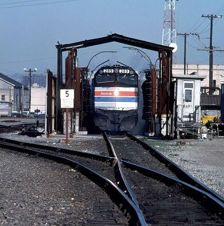 A seldon photographed feature of Amtrak's Oakland facility was the wash rack, which allowed an entire trainset to pull through just like a giant car wash. F40PHR 289 is involved in just such a manuever on April 24, 1982.