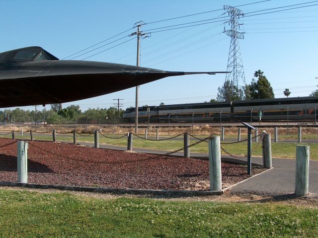 | Afternoon Train 715 blasts by Castle Air Museum in the town of Atwater on April 27, 2004. The train is in push mode as it heads towards its' next station stop in Denair. Interestingly, San Joaquin trains have no specific orientation as to which direction is lead by a locomotive, as most push-pull operations do. Railfans never know from day to day whiich trains will have a unit leading or trailing. |
