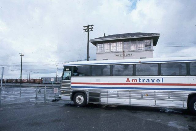 | A winter storm has just blown through the San Joaquin home port of Oakland on February 16, 1991. Sitting in front of Southern Pacific's 16th Street Tower is an Amtravel bus silently waiting for it''s next train of passengers to arrive from the Central Valley. This is Amtrak's San Francisco connection which ferry's ticketed passengers across the Bay Bridge to the Transbay Terminal, Amtrak's designated San Francisco station. |