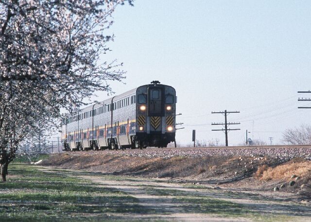 | During 2003 Amtrak implemented push-pull service on the San Joaquins. While Capitol Corridor service used push-pull operations upon delivery of the California Car equipment, the San Joaquins didn't. Starting in 2002 the practice was used only sporadically due to employee concerns about crew safety during grade crossing accidents (which are frequent on the line). By the end of 2003, however, push-pull operation was the norm and not the exception. In this photo Train 716 glides past an almond orchard just west of Ballico on March 2, 2004. |