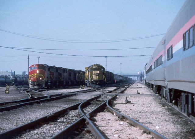 | Train 709 boards passengers on January 20, 1991 in the terminal city of Bakersfield. Out in the busy Santa Fe yard it's business as usual as Red Warbonnet GP60M 146 departs for Barstow. On the next track over another freight completes a switching move in a scene typical of the modern Santa Fe in the years before its' merger with Burlington Northern. |