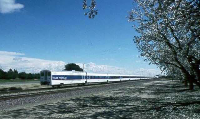 | Spring is in the air on February 26, 1996 as Amtrak tests yet another Talgo trainset in San Joaquin service. The low-slung Spanish-built Talgo cars will demonstrate their worth in only a few locations along BNSF's Stockton Subdivision. While train speeds of 79mph are allowed over much of the route to Bakersfield, there are few curves on the line that will give the equipment a work out. |