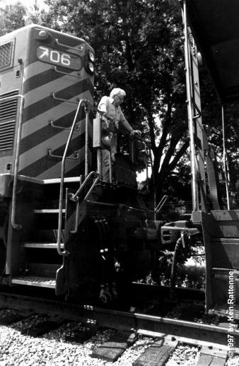 Photo by Ken Rattenne WP GP7 706 couples to the O-WPX on 8/7/82 under the watchful eye of Engineer McClure. Aboard caboose 431 isthe O-WPX's "captain," Conductor W.F. Filbeck, who is on the radio with the dispatcher in Sacramento. |