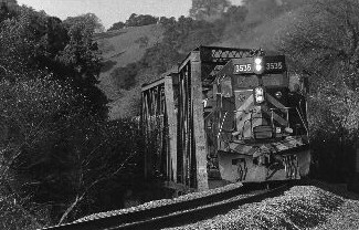 by Ken Rattenne When mentioning the term "canyon" in relation to the Western Pacific, the first thought that comes to mind is the deep chasm that formed the railroad's most scenic piece of trackage: the Feather River Canyon. But to exit the San Francisco Bay Area WP ran through another, much shorter canyon. Carved from the coastal hills by Alameda Creek, Niles Canyon stretches eight railroad miles between Fremont (formerly called Niles) and Sunol, a tiny unincorporated burg known mostly for its biker bar and a local cat that was once elected mayor (railfans often extend the boundry of Niles Canyon to just beyond Hearst Siding, including this writer). The tracks follow Alameda Creek then run briefly along the northern side of the narrow Alameda Valley. At Sunol the line makes a sharp left turn to continue through the last vestiges of the canyon. Passing through the posh Castlewood Golf Course at the west end of Pleasanton, the line finally breaks out into the Livermore Valley. Trackage through Niles Canyon was not easy to lay - Southern Pacific had already taken the easy route along the left bank of Alameda Creek more than two decades earlier. This forced WP engineers to bore two tunnels and construct a handsome steel bridge to lay their steel trail through the shadowy defile. A lot of scenery is packed into Niles Canyon: In spite of deep shadows and a rain forest-like atmosphere, it has drawn a steady stream of photographers to record the parade of trains running between Oakland and Stockton on what was once Western Pacific's First Subdivision. Today, the trackage through Niles is still active, but just barely. Since the Union Pacific-Southern Pacific merger UP has moved the majority of their transcontinental traffic to the former SP lines and thus few freights see the depts of Niles Canyon. The one bright spot is the Altamont Commuter Express' daily parade of passenger trains, which can be photographed only during the summer months, and even then only in the late afternoon. |