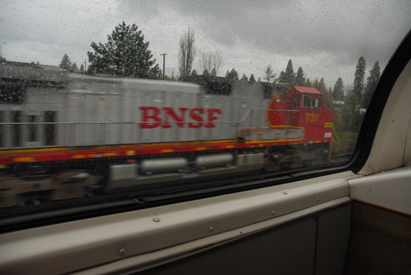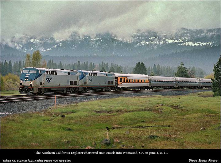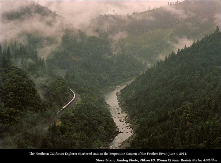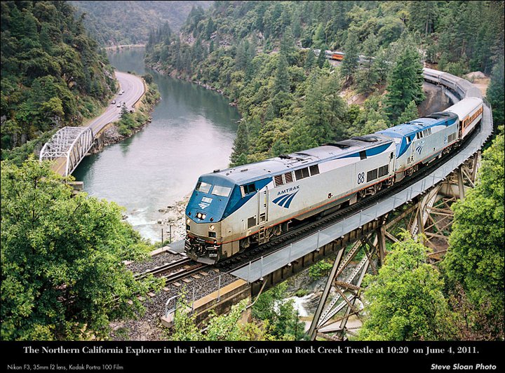 Arriving at Keddie at 11:45 a.m., the train paused as the UP pilot detrained and the BNSF pilot boarded the locomotive. From Oroville to Klamath Falls we travel over freight-only trackage that Amtrak crews are not qualified on. From Keddie to Klamath Falls we travel over BNSF's 202-mile Gateway Subdivision. Opened in November 1931, Western Pacific constructed this line from Keddie to Bieber where it met the Great Northern from Klamath Falls. This Inside Gateway provided a competitive route to Southern Pacific's Shasta line between the Pacific Northwest and Southern California with a GN-WP-Santa Fe route. The line to Bieber was downgraded when UP took over WP. As a condition of the UP-SP merger, UP granted trackage rights to BNSF from Stockton to Salt Lake City, Utah over the ex-WP route and directed UP to sell the Keddie to Bieber portion to BNSF. Just Turn Left At Keddie Departure from Keddie was at 11:56 a.m. From Keddie to Moccasin the maximum speed is 12 mph as the track was clinging to a rocky wall high above Spanish and Indian creeks as we head up a 1.5 per cent grade. At Moccasin we meet a southbound BNSF general freight powered by General Electric ES44DC No. 7349 with a two-unit Distributed Power Unit on the rear. Because the Gateway Subdivision is dark territory and operated by Track Warrant Authority, meets are complicated. Extra 7349 was granted track authority on the main line to the south limits of Moccasin siding. Amtrak 88 North was granted track authority to the south limits of Moccasin with instructions to take siding. Because the length of Extra 7349 exceeded the 4208 feet of the siding, a saw-by was required. For this to happen, once Amtrak 88 was in the clear on the siding it had to release its track authority. Then the dispatcher granted 7349 authority from South Moccasin to Keddie. This allowed the freight train to pull down to clear the north siding switch and release his track authority to Moccasin and in turn the dispatcher granted track authority to the excursion train to enter the main track and continue north. The meet at Moccasin delayed us about 27 minutes. Clear Creek Junction Continuing on, we follow the shore of