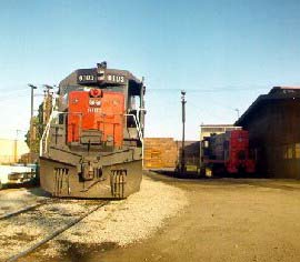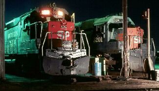 | It's January of 1973 and SP SD45 9103 sits on one of the open-air whisker tracks along with 1953-built Fairbanks/Morse H12-44 switcher 2357. Delivered in 1969, the 9103 is in its as-delivered appearance. Within a short time the unit would receive "SP" in block letters on the nose. | (Both photos by Ken Rattenne)