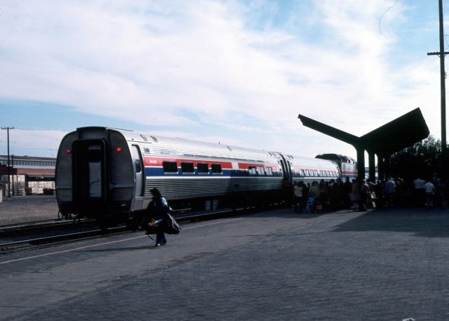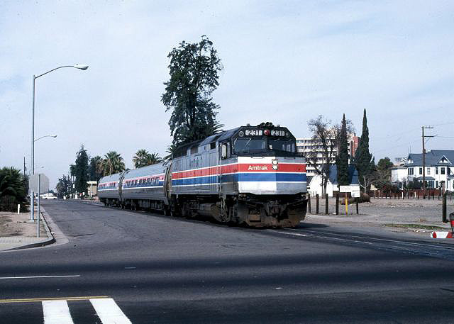 Street Running in Fresno! A single coach and Amlounge car ia all that makes up Train 710 in this January 18, 1981 view. San Joaquin service now featured two roundtrips a day, the second being added on February 3, 1980. Often the second train would be a shortie, like today's. | The Fresno station was one of the first to recieve funds for improvements due to the high passenger loads generated by the second largest city in the San Joaquin Valley. |