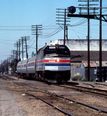 ![]() (Left) SDP40F 543 is fresh from it's stop at Stockton and has just crossed Western Pacific's mainline at grade. It's June 12, 1976 and the brief SDP40F era is nearing its end. (Above) Thirteen months later, on July 16, 1977, F40PH 222 and three Amfleet cars mark the San Joaquin's transition from steam heat to head end power (HEP), Amtrak's new standard for it's passenger car fleet. |