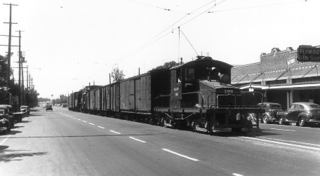 (Above right) Electric freight motor No. 100 escorts a steam train south down Ninth Street in July of 1946 (Arthur Lloyd - Rattenne Collection)