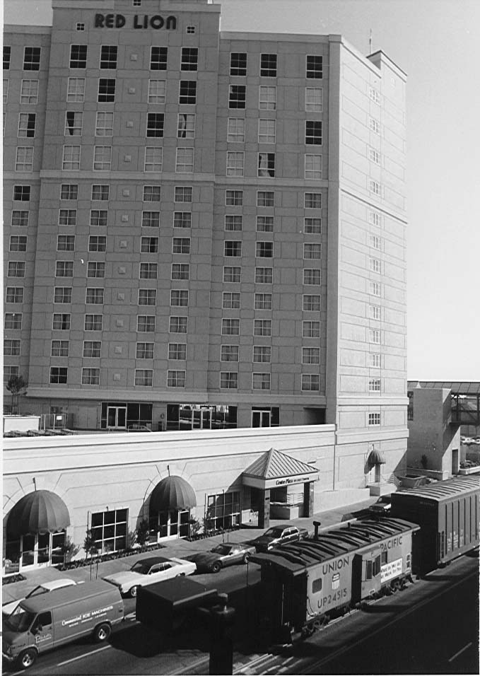 (Above) A Union Pacific caboose passes the former Red Lion Hotel, built as part of Modesto's downtown revitalization project in the early 1990s. (Ken Rattenne Photo)