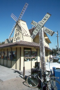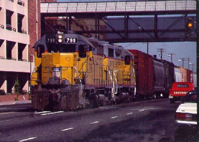 It's a warm, bright summer Saturday morning as we drive north along Ninth Street in Modesto's downtown district. The temperature has already reached 87 degrees at 10:30 in the morning, a sure sign that we're in for another Century mark day. As we make our way through the gauntlet of poky cars and traffic lights we constantly peer down the street, apprehensive that our quarry will appear before we're in place for our shot. The object of today's hunt is Union Pacific's local freight train that runs six days a week between Stockton and Modesto. The photograph we're after is one of the train rolling down the middle of Ninth Street, performing it's little dance with traffic for 1.1 miles of street running. As we approach the Old Mill Cafe we quickly turn left across track and traffic, pulling into a parking lot across the street from the quaint eatery. We grab our cameras and focus on the rails that curve around the north side of the cafe building. From here to D Street the rails are embedded in the pavement like street car tracks, marking the start of Modesto's infamous "street running1." Suddenly, the morning air is broken by the intruding blast of air horns. We we're just in time! A moment later we see the nose of the lead locomotive poke around cafe's corner, its headlights on full bright. Like a pair of cautious cats, Union Pacific GP35s 798 and 793 pause just long enough for the engineer and fireman to gauge the amount of traffic on the street. Then, with a wary eye and little to-do, the engineer of train LLF53 slowly notches his throttle forward. Puffs of grey-white exhaust shoot above the locomotives as 5,000 horses pull on 4,100 tons of train. As the train creeps slowly onto Ninth Street automobile traffic begins