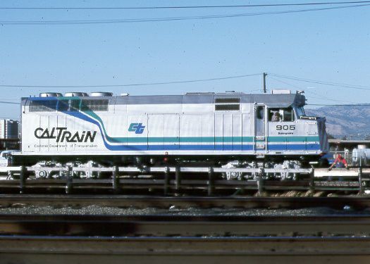 On October 27, 1998, B32-8WH 2052 (ex-Amtrak 502) blasts through Modesto with a set of California Cars after departing Riverbank only moments before with the San Joaquin. . (Ken Rattenne Photo) | CalTrain 1985-built F40PH-2 905 takes its turn on the turntable in San Jose not long after its delivery. (Ken Rattenne Photo) | Amtrak F59PH 460 speeds a Surfliner south through Del Mar on September 19, 2008. Theformer San Diegan train name was changed to Surfliner when Amtrak California rebranded the service and added California Cars. The F59s belong to Amtrak. |
