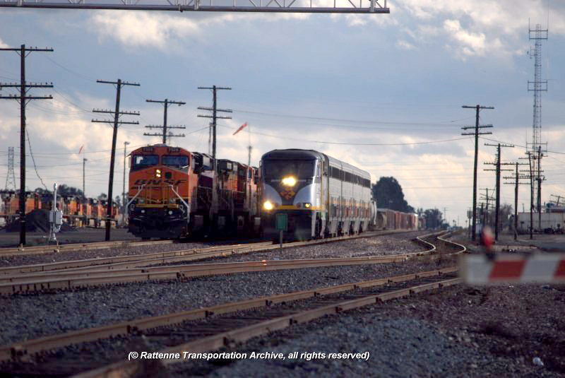 Amtrak California F59PHI 2009 passes a BNSF freight as it speeds through Riverbank Yard with a northbound San Joaquin on December 12, 2008. Six months later the San Joaquin has just left the Modesto depot and will run along the aptly named Santa Fe Road for another mile. The San Joaquins uses BNSF tracks between Port Chicago and Bakersfield, maintaining a respectable 79 mph along much of the route. BNSF does a better than average job keeping the trains' schedules. |