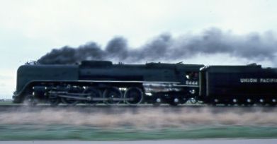 "The cold quickly stung our toes with pain, and the people who strung along the track wandered here and there and stomped their feet. A train or two passed, but there was no sign of the old steam engine with the cow catcher. "We milled about, that half-hearted gathering of the cold and the curious. Over there was Mr. Williams...wait... "A hoarse whistle moaned...Lord! MERCY! It was unbelievable! ""Old" 8444 exploded across the Front Street track like a page from Armageddon. It would be inappropriate to say the old geezer was smoking - she was breathing fury like a black demon. You'd a thought she was mad at somebody. And m-o-v-i-n-g? That iron monster never heard of chug-a-chug. She hit with such blithering force that it caused terror to rise up and go forth. Black thunder swept all breath away and the air roared with mocking anger. "A hunnert miles and hour! A hunnert miles an hour!" the people would say later with disbelief, for the wind from 8444 blew one onlooker right off the railroad crossing. "Before she even got here, No. 8444 was gone! It was awesome, just awesome." - Marie Watkins, 1984 Reprinted from a Union Pacific promotional piece. |