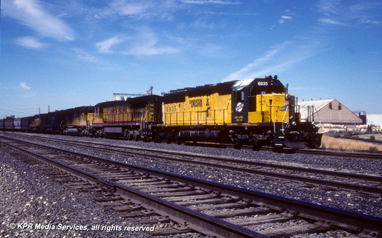 (Right) C&NW SD40-2 6935 switches at Stockton Calif on August 24, 2000