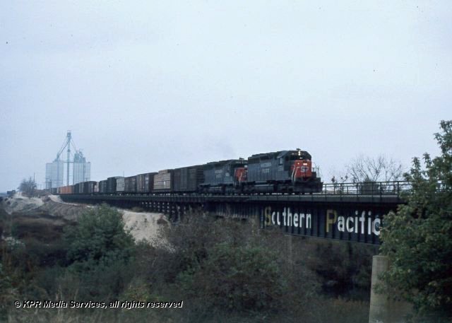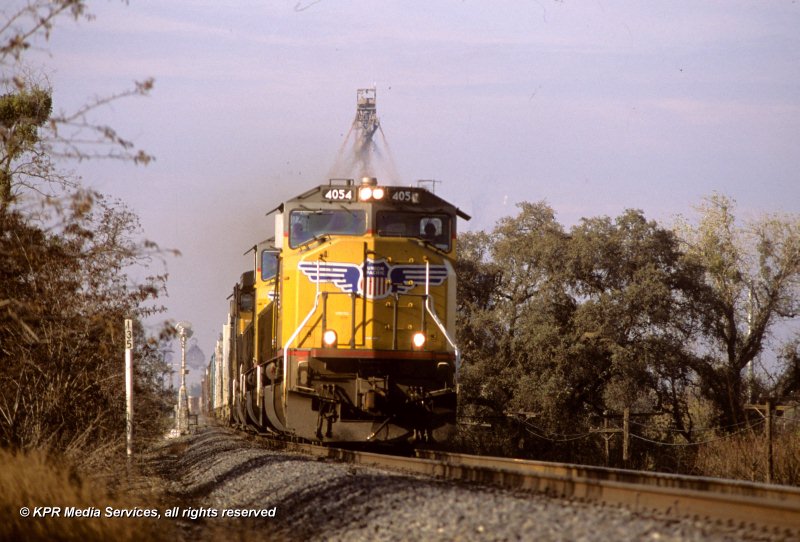 (Right) Union Pacific 4054 South races past my camera on December 16, 2003 However, when I sought it out I was dismayed to find the trees and underbrush had grown to a height so as to obscure the Southern Pacific lettering that made my 1980 photo so memorable. In 2017 one can still catch freights on the bridge, though they are led by Armor Yellow diesels instead of grey and scarlet. The underbrush is now so high one can barely see the Southern Pacific lettering on the faded side of the bridge which is just as well since several layers of graffiti now cover most of the letters. - Ken Rattenne