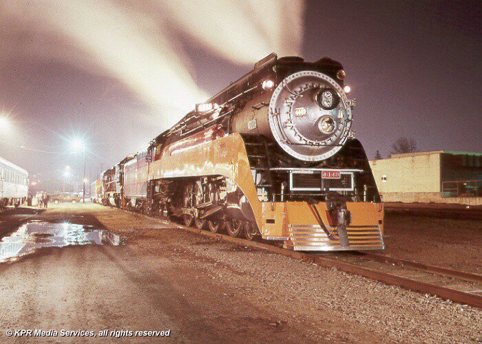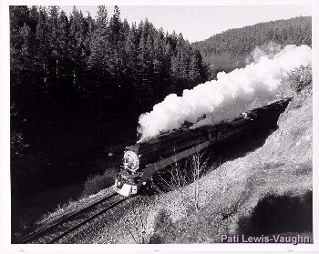 The date is a very crisp December 15th 1988. The place, Roseburg, Oregon. The 4449 is in the midst of pulling a shippers special for Phillip Anschutz, owner of the new Southern Paciic-Rio Grande system. The unusual part of this outing for 4449 is that it was the first time the big Daylight would traverse Southern Pacific's Siskiyou Line. The special Departed from Portland, Oregon on December 14th, running the short distance to Eugene. Then on the 15th, it was Eugene to Roseburg, where the power was cut off from the train for the night. Amazingly, the Winter weather in the Pacific Northwest had been glorious, and 4449's passage through the Oregon countryside yielded an impressive number of bright sunlit photos. Though tomorrow will start out with a freezing fog, the day will turn out to be crisp and clear for the run south through the Siskiyous. But tonight it's the hour for those equipped with tripods, cable releases, long-johns, heavy coats and the wherewithall to capture the World's most beautiful locomotive on film with after dark.