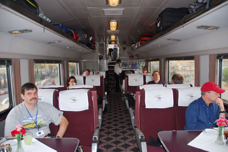 Rear car ATSF 33 featured a Northern California 2011 Explorer drumhead designed by the club's Martin Rice. Stops were made at Richmond and Martinez to pick up additional passengers. Departing Martinez, the train was delayed for 14 minutes when the Suisun Bay drawbridge was opened to allow an eastbound ship to pass. A stop was made at Davis for additional passengers, with arrival in Sacramento at 4:15 p.m. Passengers were allowed off the train during the twenty-minute stop to photograph the train. Departing Sacramento at 4:35 p.m. the train made the short trip to Haggin where it turned north to join the former Western Pacific line to Oroville (now Union Pacific's Sacramento Subdivision). At Mounkes, we met a westbound BNSF freight. Passing Sankey, equipment of Modoc Railroad Academy could be viewed on a former Sacramento Northern line. Continuing through Marysville the train crossed the ex-Southern Pacific Roseville-Dunsmuir line, now UP's Valley Subdivision. A short stop was made at the Oroville Yard where a westbound UP ballast train and a BNSF freight were met. Oroville once had extensive yard operations and was a crew change point under WP. Now the yard is the base for maintenance of way operations and a couple of local freight trains. Arrival at the ex-WP depot was at 6:18 p.m. Many excursionists ate at a buffet dinner at the Western Pacific Brewing & Dining restaurant located in the former depot. Charter buses transferred passengers to local hotels in Oroville and Chico. Additional Notes On The Consist Private car Caritas came out from