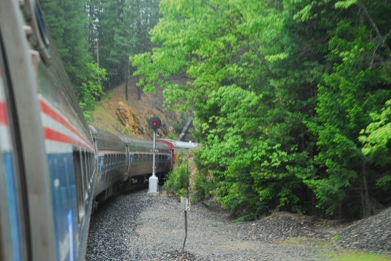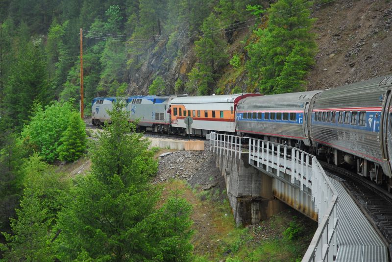 Arriving at Keddie at 11:45 a.m., the train paused as the UP pilot detrained and the BNSF pilot boarded the locomotive. From Oroville to Klamath Falls we travel over freight-only trackage that Amtrak crews are not qualified on. From Keddie to Klamath Falls we travel over BNSF's 202-mile Gateway Subdivision. Opened in November 1931, Western Pacific constructed this line from Keddie to Bieber where it met the Great Northern from Klamath Falls. This Inside Gateway provided a competitive route to Southern Pacific's Shasta line between the Pacific Northwest and Southern California with a GN-WP-Santa Fe route. The line to Bieber was downgraded when UP took over WP. As a condition of the UP-SP merger, UP granted trackage rights to BNSF from Stockton to Salt Lake City, Utah over the ex-WP route and directed UP to sell the Keddie to Bieber portion to BNSF. Just Turn Left At Keddie Departure from Keddie was at 11:56 a.m. From Keddie to Moccasin the maximum speed is 12 mph as the track was clinging to a rocky wall high above Spanish and Indian creeks as we head up a 1.5 per cent grade. At Moccasin we meet a southbound BNSF general freight powered by General Electric ES44DC No. 7349 with a two-unit Distributed Power Unit on the rear. Because the Gateway Subdivision is dark territory and operated by Track Warrant Authority, meets are complicated. Extra 7349 was granted track authority on the main line to the south limits of Moccasin siding. Amtrak 88 North was granted track authority to the south limits of Moccasin with instructions to take siding. Because the length of Extra 7349 exceeded the 4208 feet of the siding, a saw-by was required. For this to happen, once Amtrak 88 was in the clear on the siding it had to release its track authority. Then the dispatcher granted 7349 authority from South Moccasin to Keddie. This allowed the freight train to pull down to clear the north siding switch and release his track authority to Moccasin and in turn the dispatcher granted track authority to the excursion train to enter the main track and continue north. The meet at Moccasin delayed us about 27 minutes. Clear Creek Junction Continuing on, we follow the shore of